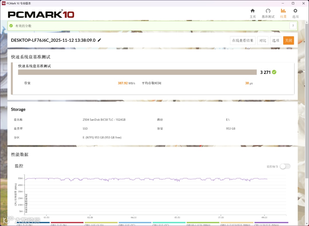 办公场景选用PCMark10进行测试,样品最终成绩为3,271分,带宽387.92 MB/s,平均存取时间38 μs。无论是批量处理Excel表格、导出高清视频,还是同时打开多个浏览器标签页,均能保持流畅响应,满足日常办公与内容创作需求。