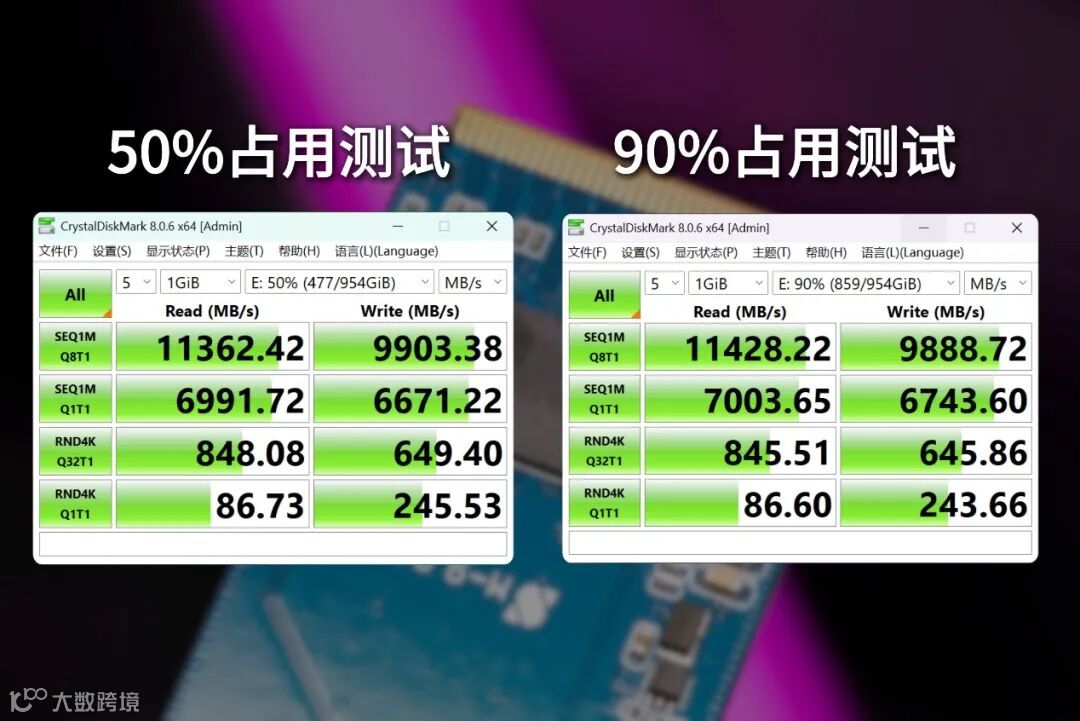 模拟真实50%和90%占用情况再次进行测试,样品性能一致性依然非常出色,与空盘成绩相比没有明显降速现象,均保持在同一水平线上。