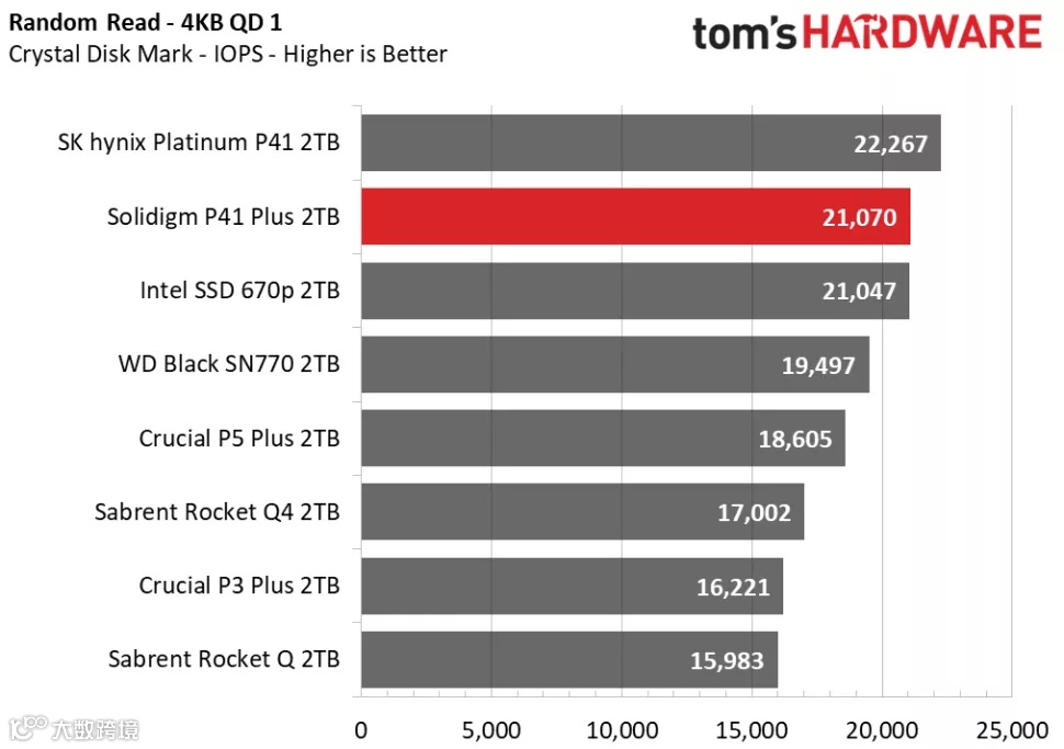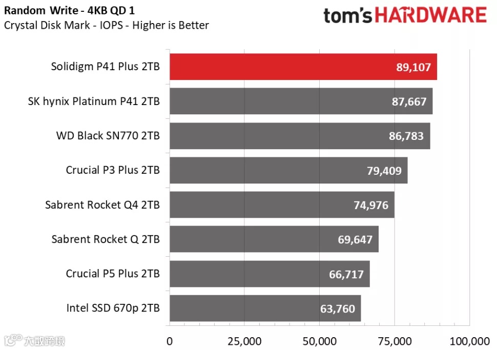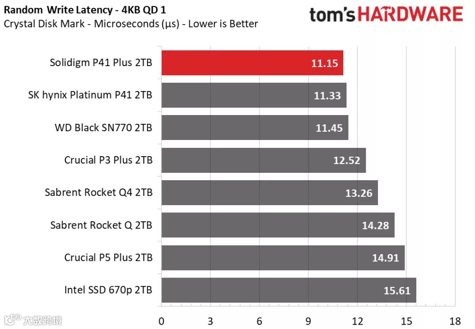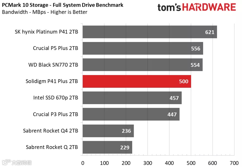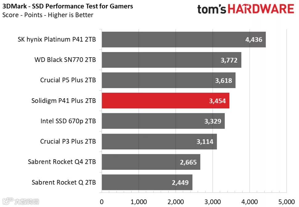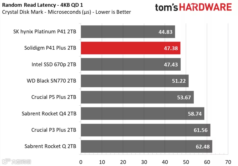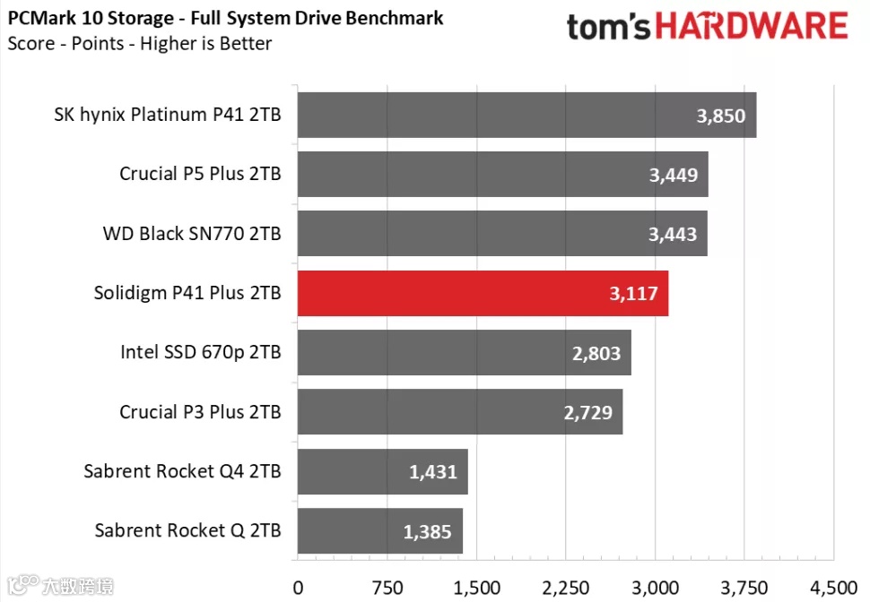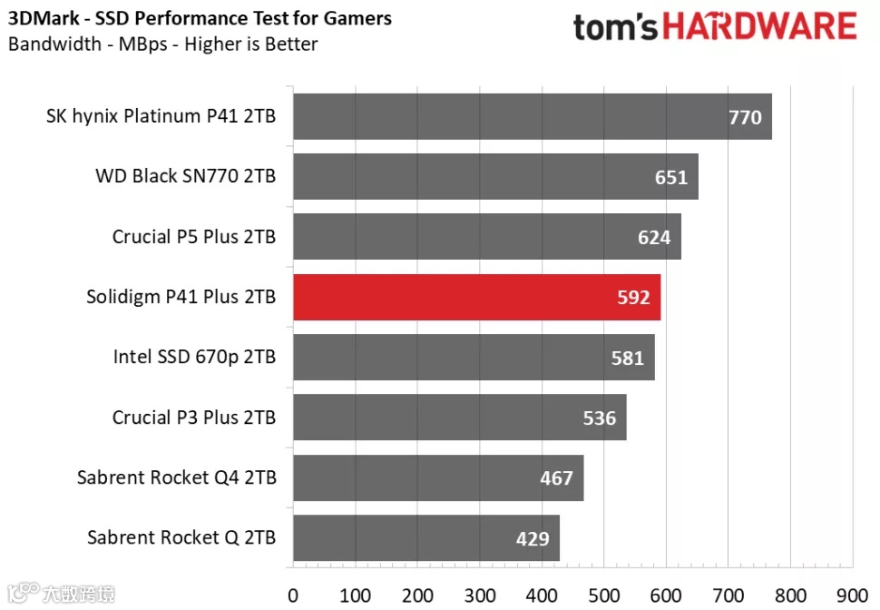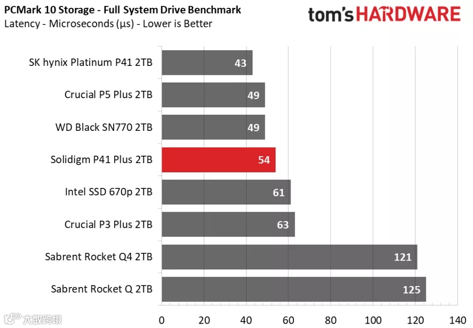 3DMark的存储基准测试是专为游戏玩家设计的,侧重于真实世界的游戏性能,测试包括加载游戏、保存进度、安装游戏文件和录制游戏视频流。在Tom's Hardware的3DMark存储测试中,P41 Plus在得分、带宽、延迟三项数据的排名中都处于中间位置,击败了其他QLC SSD,并且与其他DRAM-less设计的TLC SSD的性能十分接近。