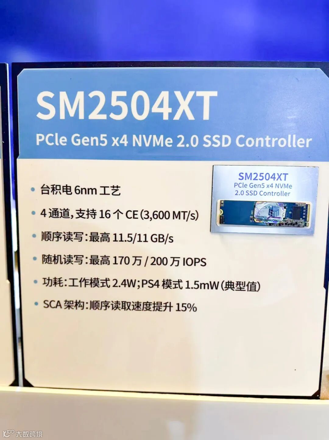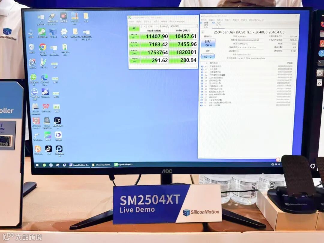 现场还通过实机演示了主流级DRAM-less主控芯片SM2504XT的卓越性能。该主控芯片采用4通道、3600MT/s设计,支持PCIe 5.0接口,可实现超过12GB/s的顺序读取速度和2M IOPS的随机性能 ,为AI PC主流市场带来高性价比的存储加速方案。