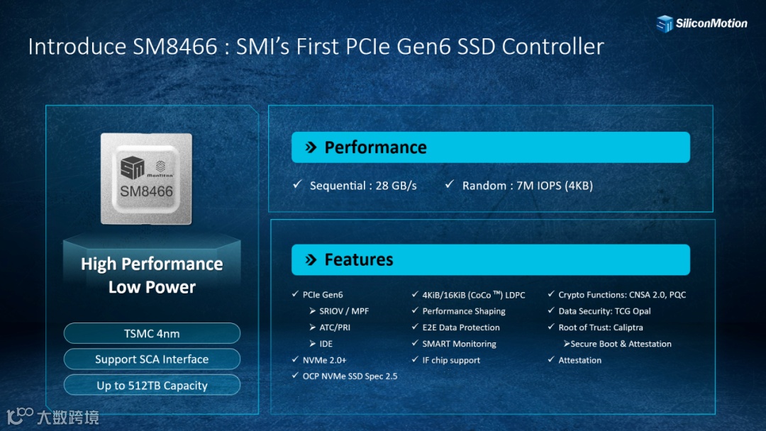 面向下一代AI服务器,慧荣科技还预告了PCIe Gen6企业级SSD主控芯片SM8466。该主控芯片采用业界领先的4nm工艺,顺序读写速度高达28GB/s,随机性能达7M IOPS,并搭载创新的16K LDPC纠错引擎及全面的安全功能,为未来AI数据中心的极致性能与高能效比树立了新标杆 。