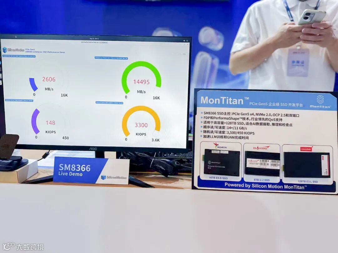 企业级存储: 针对AI数据中心和企业级服务器,慧荣科技展示了其旗舰级PCIe Gen5企业级SSD开发平台MonTitan™,以及高性能的SM8366主控芯片。SM8366采用16通道设计,为要求严苛的AI和计算存储工作负载提供强大动力。