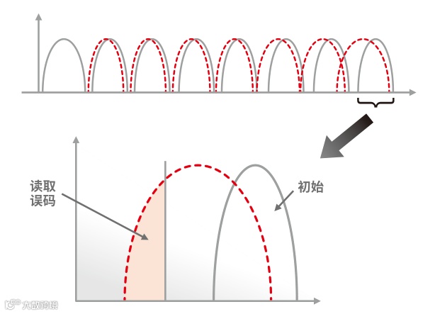 在NAND Flash中,通过不同的电荷量来存储多个比特位,因此数据读取时需要监测出电流量大小以确定电荷级别。在存储单元中会因为老化而导致电子泄漏,当电子泄漏导致单元电压低于某个阈值时,就无法再正确地读取这一单元。TLC和QLC类型存储器利用单个存储单元存储多个比特位,大大提高了存储密度,降低了存储成本,但同时也增大了误码率。