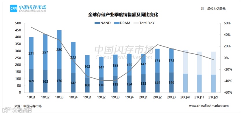 CFM研究显示,NAND Flash市场规模在三季度创下近两年来的收入高峰后,由于服务器市场主要OEM客户库存继续调整使得需求相对疲软,再加上NAND Flash平均价格的下滑,2020年四季度全球NAND Flash市场销售收入环比减少3.3%至141亿美元。