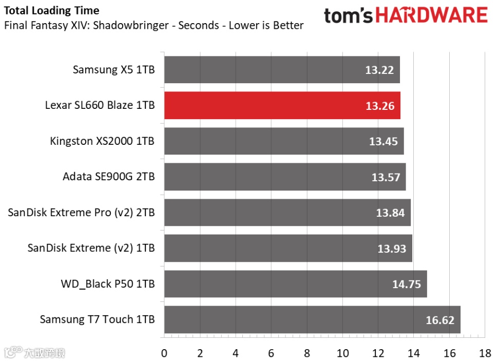 在《最终幻想14》的加载测试中,雷克沙SL660 Blaze达到了榜单中的第二名,并且13.26秒的成绩与第一名的13.22秒相差无几。作为一款游戏移动固态硬盘,这样的成绩可以说是实至名归。