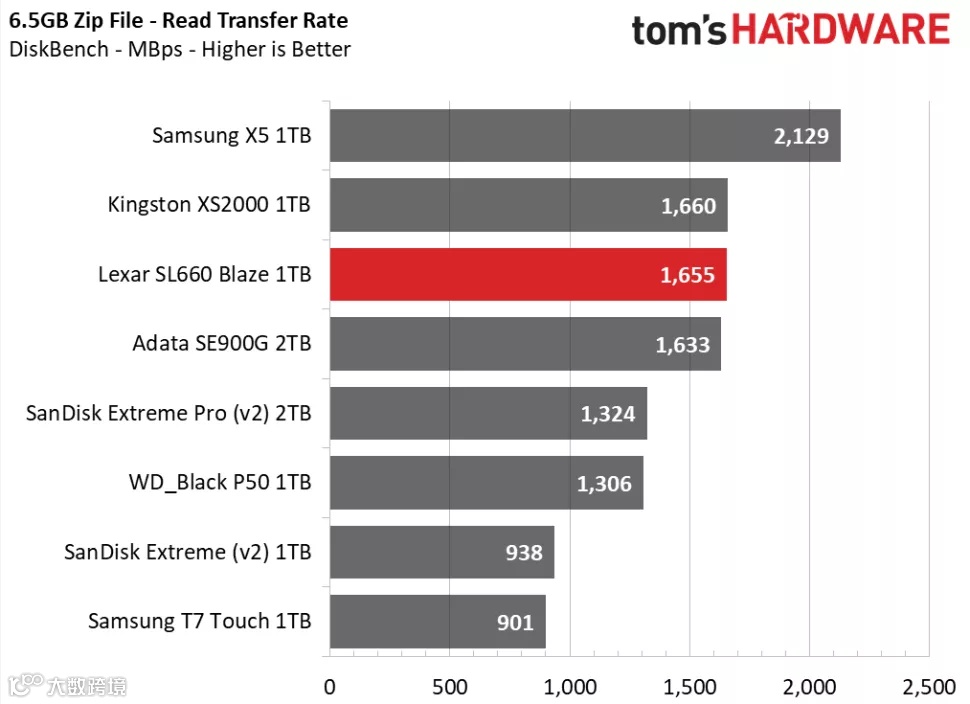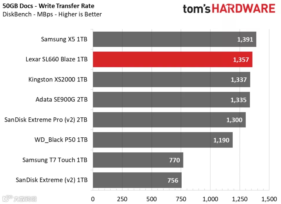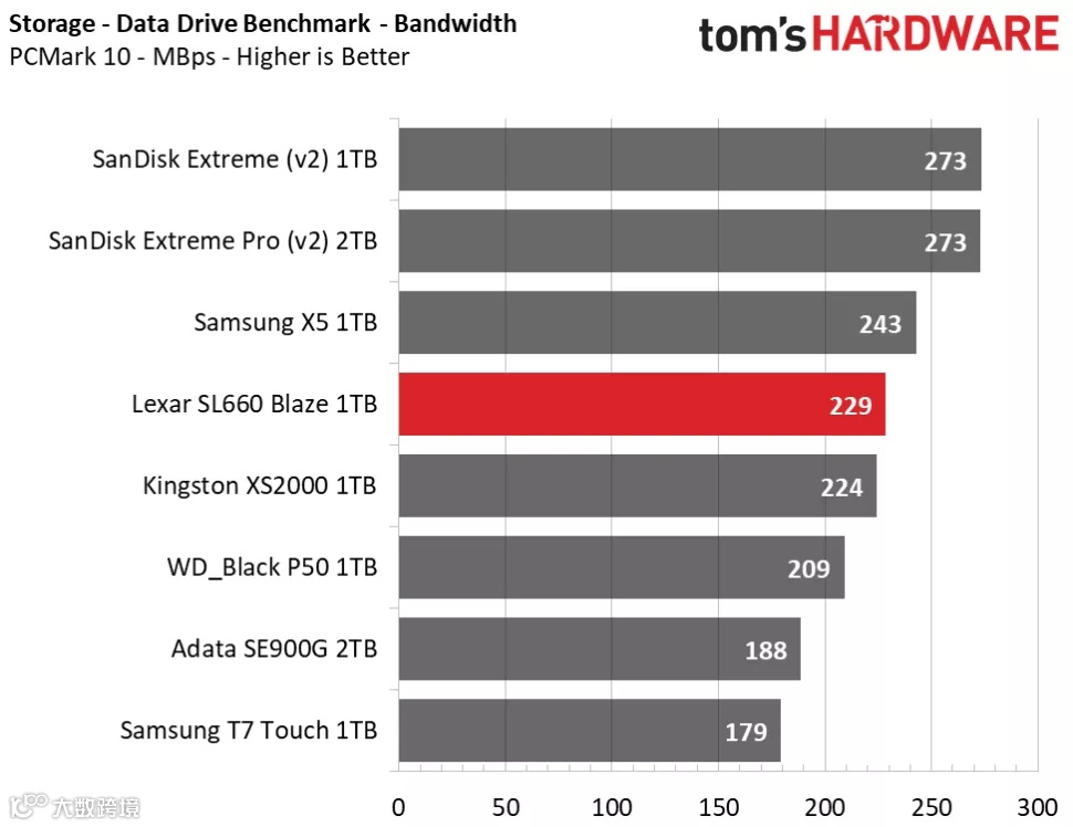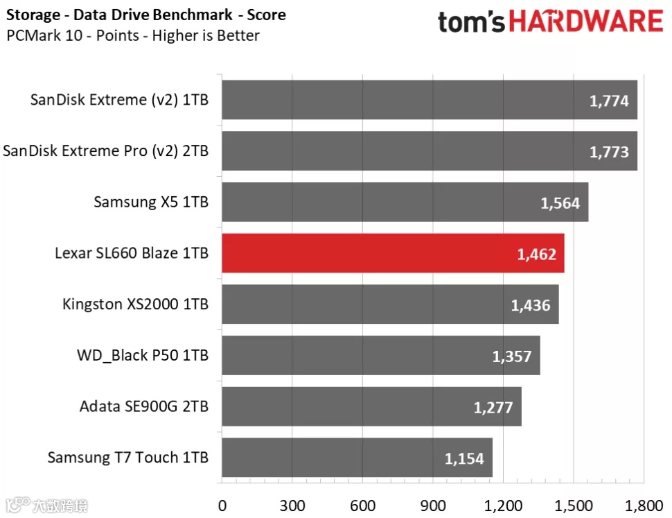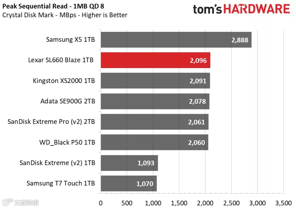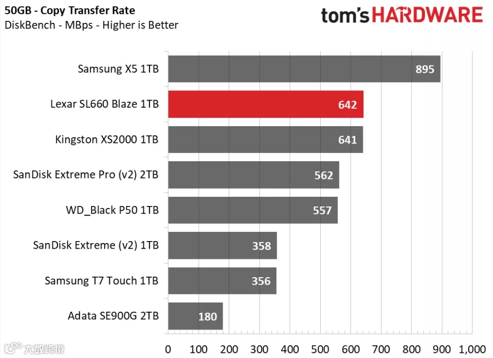 从测试榜单中可以看到,雷克沙SL660 Blaze与金士顿XS2000一同排在了USB接口移动硬盘的前两名,甚至超过了拥有内置DRAM缓存的SanDisk Extreme Pro v2。(三星X5为Thunderbolt 3接口)