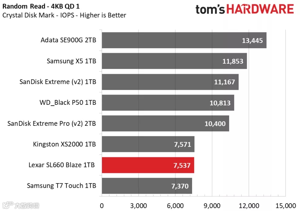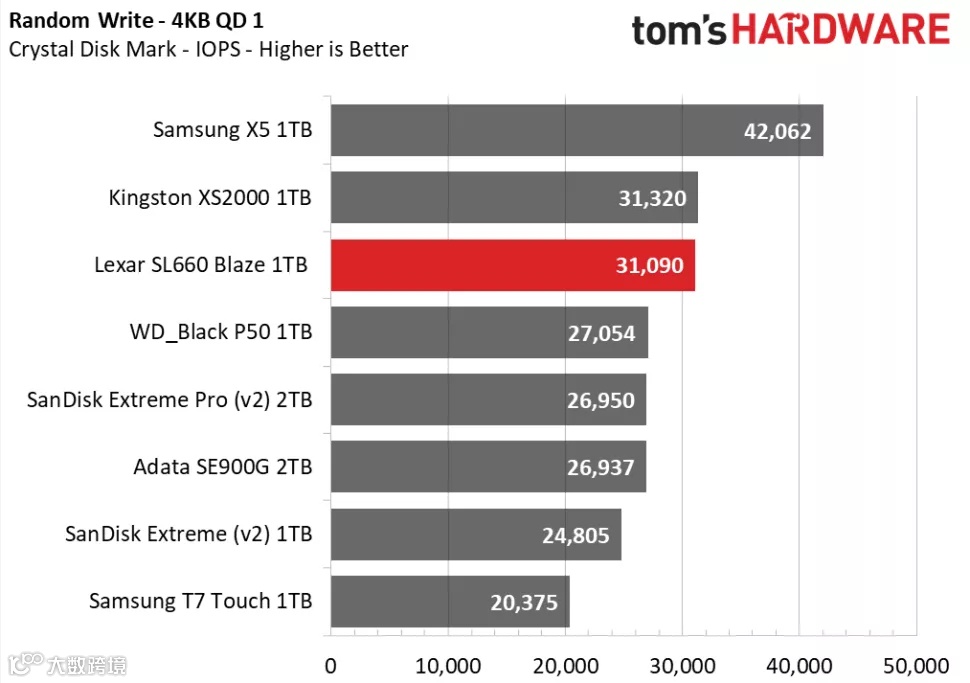 而在随机性能测试,雷克沙SL660 Blaze的随机读取性能有所落后,写入性能依然保持了USB移动固态硬盘中的最高水准。