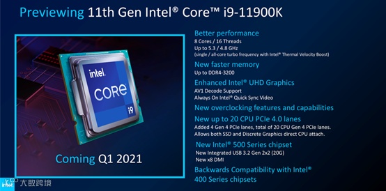 在CES大展首日,Intel就为大家带来了第11代移动端高性能处理器以及桌面处理器,总共拥有53款型号,覆盖商用、教育、移动以及游戏领域,其中第11代桌面处理器在微架构上进行了更新,性能相比上代将会提升19%,并且桌面处理器也将跟随移动端处理器的脚步,全面支持PCIe 4.0直连,通道数量也将从16增加至20。