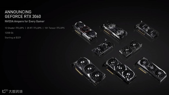 英伟达这边同样也是针对移动端和桌面平台,发布了全新的RTX 3060桌面端显卡,移动端这边则是RTX 3060、3070以及3080显卡一同公布。其中RTX 3060显卡达到了2倍于GTX 1060的光栅化性能,10倍于GTX 1060的光线追踪性能,足以流畅运行顶级游戏。