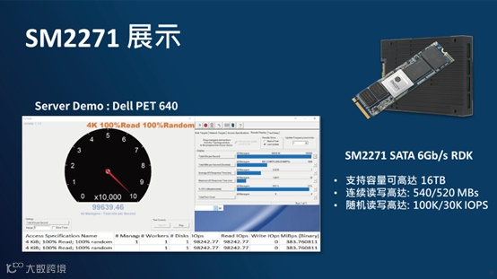 SM2271作为一款实现高容量及高性能的企业级SATA SSD控制器,主要是用来替换低性能的HDD,在提供高性能的同时,尽可能以较低的成本实现更大容量的数据存储。SM2271主控芯片内建8个NAND闪存通道,可将SATA接口性能最大限度发挥出来,连续读取最高可达540MB/s,连续写入最高可达520MB/s,随机读取高达100K IOPS,随机写入高达30K IOPS。可搭配3DTLC/QLC颗粒,最高容量可达16TB。