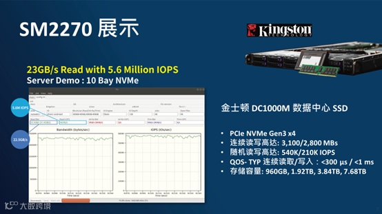 SM2270一经推出,就受到了众多数据中心和企业的关注,其中金士顿DC1000M数据中心SSD正是采用SM2270主控芯片,专为高密度资料传输工作负载进行设计,是金士顿在数据中心固态硬盘系列中最顶级产品。适用于云端计算、网络主机、高效能运算中心(HPC)、虚拟机、AI及深度学习应用。