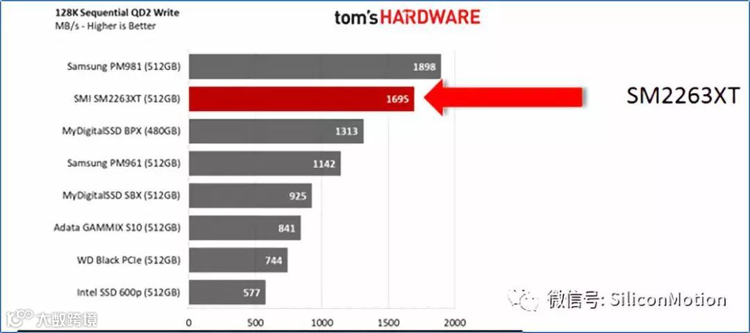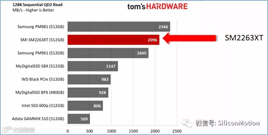 不多说,我们先来看看国外权威机构tom'sHARDWARE的评测,慧荣SM2263XT的持续读取,仅次于三星顶级性能的PM981,并且性能表现非常稳定。