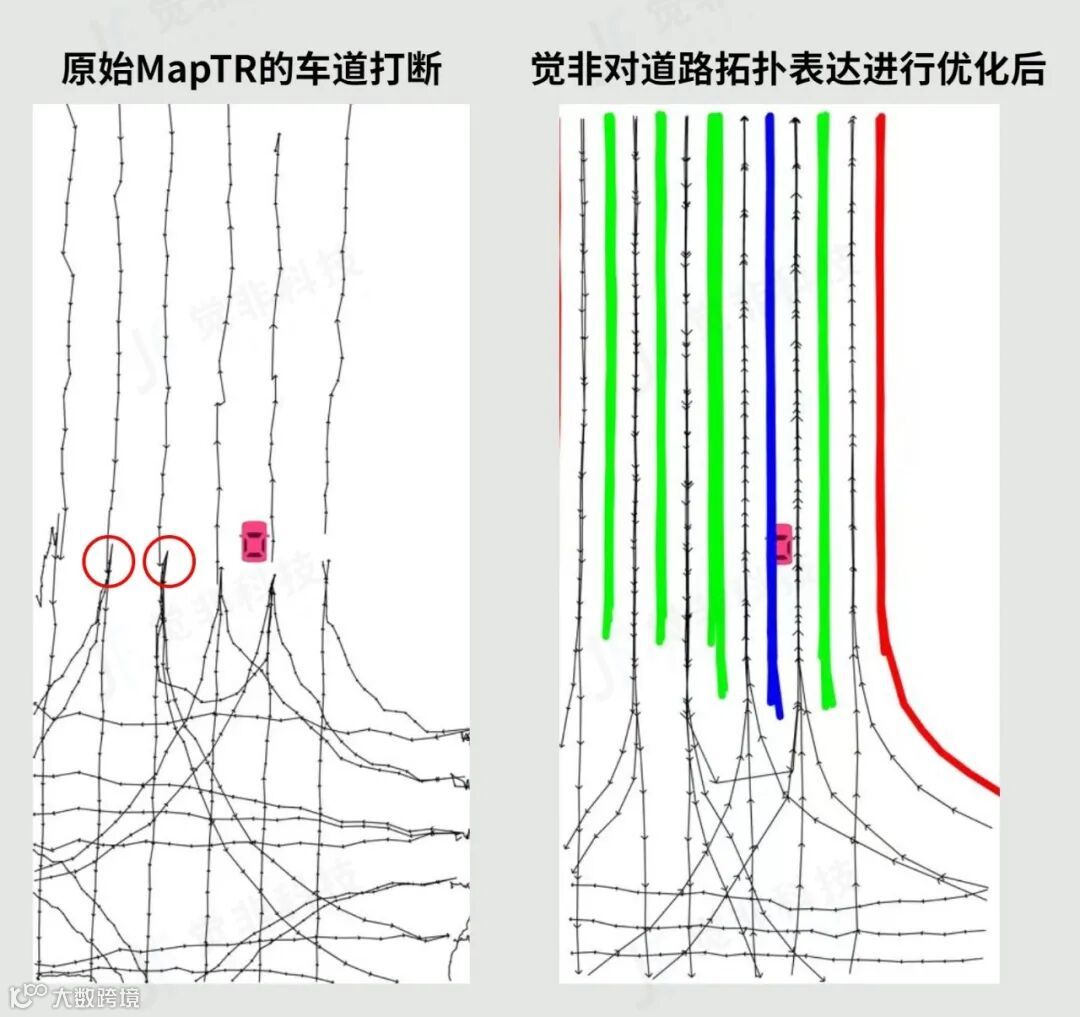 MapTR检测的车道对象通常会被拓扑分歧点打断,觉非科技的方案可以把被分歧点打断的车道重新挂接,无需后续手动处理车道挂接。这样的方式虽然会导致检出车道的部分重复,但可以使每个车道更加独立,车道形状更加连续与平滑,特别是在车道分叉频繁的场景下,可以为模型提供更明确的监督信号,提升整体模型在实际场景中使用的稳定性。
