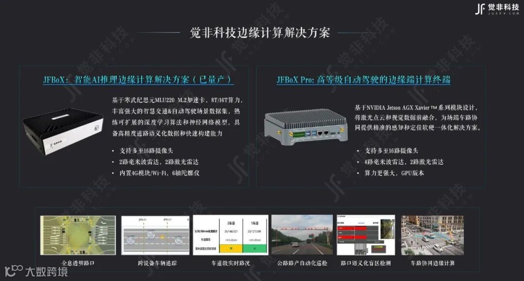 同时,觉非科技自主研发了边缘计算终端与解决方案。该方案具备强大的智能驾驶场景数据集,结合觉非科技可扩展的深度学习算法和神经网络模型,将激光点云和视觉数据融合,为场端车路协同提供精准的感知和定位软硬一体化解决方案。