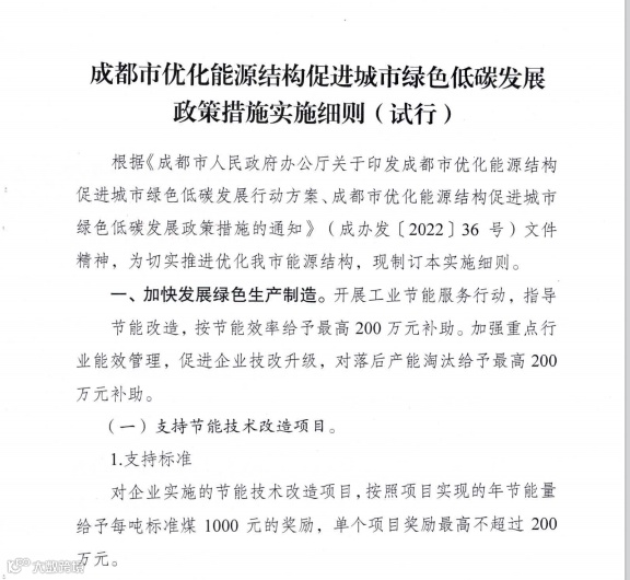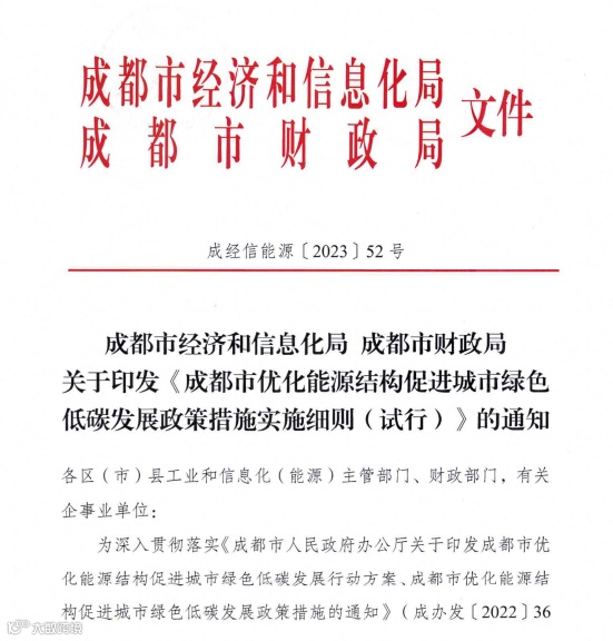 近日,成都市经济和信息化局、成都市财政局联合印发《成都市优化能源结构促进城市绿色低碳发展政策措施实施细则(试行)》(以下简称《实施细则》),要求加快发展绿色生产制造,推进能源数字化转型,加快智能电网建设,推动化石能源清洁高效利用,支持可再生能源利用。同时对企业实施的节能技术改造项目、重大用能设备电能替代改造等给予财政奖励。