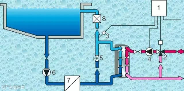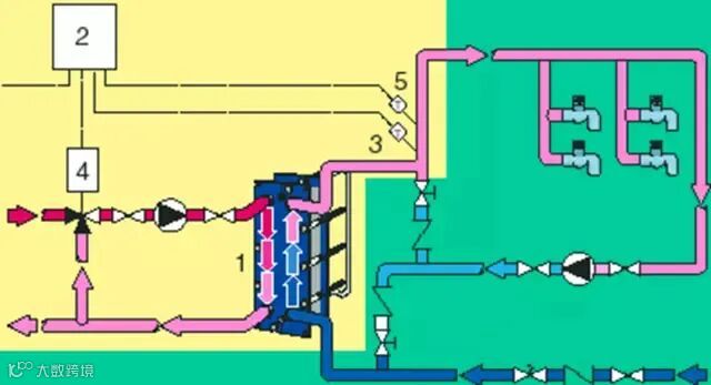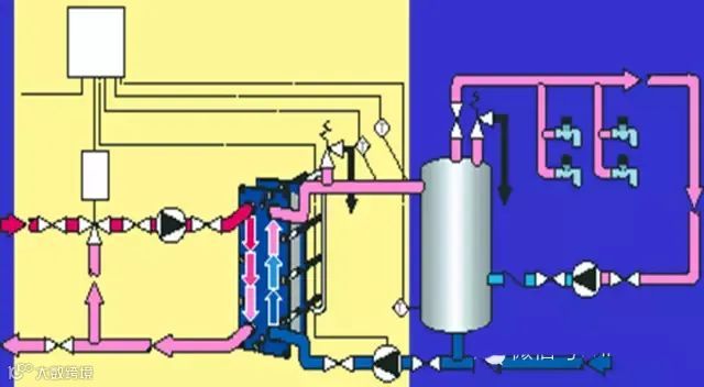流经用户散热片后的低温水(二次回水)经过滤器除污后,由循环泵加压进入换热器,吸收一次热媒放出的热量,达到供水设定