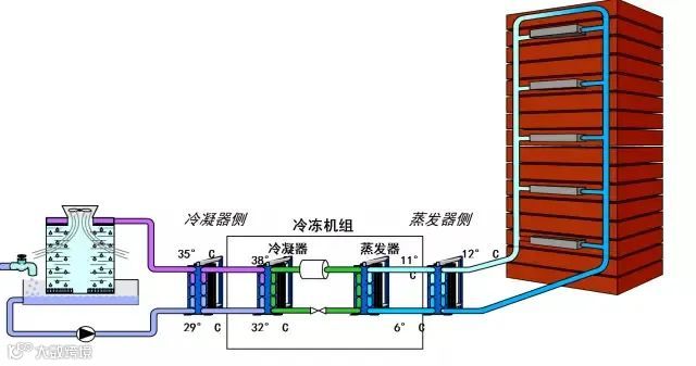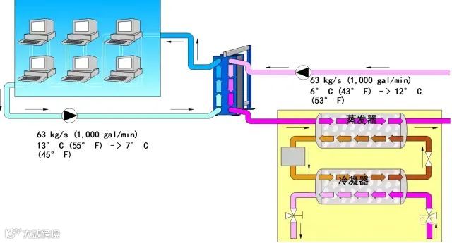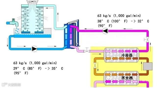 蒸发器侧热交换器可以起到以下作用:避免冷冻机组承受高压(压力接力系统);减少昂贵、低效添加剂的用量;分离冷却水系统,以保证局部系统清洁度很高(电子元件生产);减少泄漏所带来的损害。