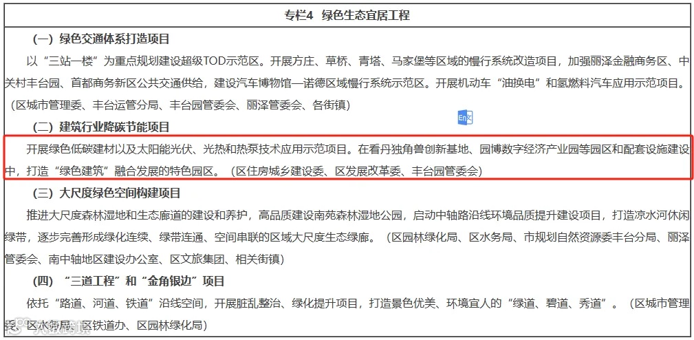 推动绿色建筑高品质发展。因地制宜推广建筑领域太阳能光伏、光热和热泵技术应用,新建政府投资工程使用至少一种可再生能源。严格落实建筑节能、绿色建筑、市政基础设施等领域节能降碳标准,积极推进超低能耗建筑规模化发展,建立全生命周期的能耗和碳排放约束机制。大力发展装配式建筑,丽泽金融商务区、中关村丰台园区具备条件的工程建设全过程绿色建造。推进城镇既有建筑和市政基础设施节能改造,统筹实施智能化控制、供热资源整合、热网系统重组,提升可再生能源供热比重,持续降低供热系统碳排放和污染物排放。积极支持超低能耗或近零能耗建筑建设。