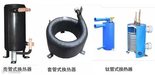 常见种类:壳管式换热器(常规热水机组),钛管式换热器(泳池机组),套管换热器(风冷模块机组)。
