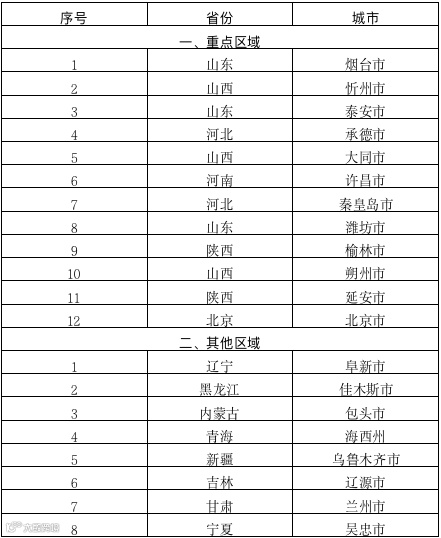 其中包括山东3个,山西3个,河北2个,陕西2个,北京市以及河南、辽宁、黑龙江、内蒙古、青海、新疆、吉林、甘肃、宁夏各入围一市。加上2017-2019年已纳入中央财政冬季清洁取暖试点的43个城市,总支持城市数量达到63个。