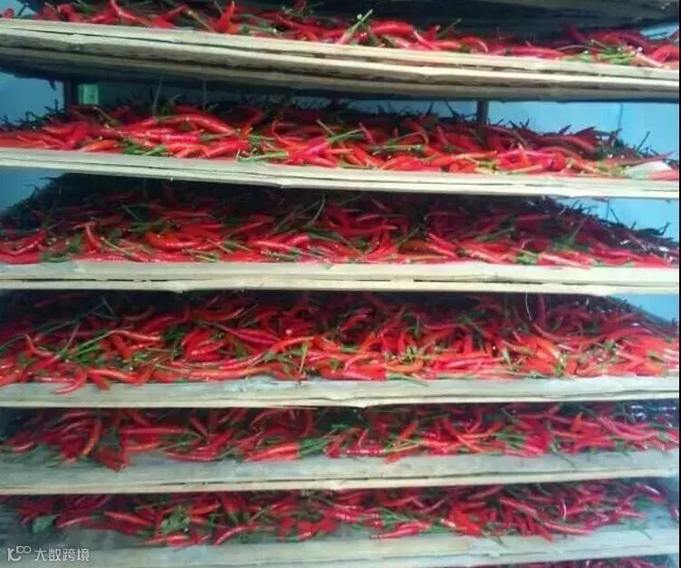 3、采用分段干燥法,分段干燥是目前辣椒干燥较优越的方法。采用分段烘干对辣椒品质和烘干时间、烘干量都有很大影响。辣椒在烘干过程中都有明显的软化和膨胀现象。烘干后的辣椒颜色一致,红润光滑,含水率平衡。