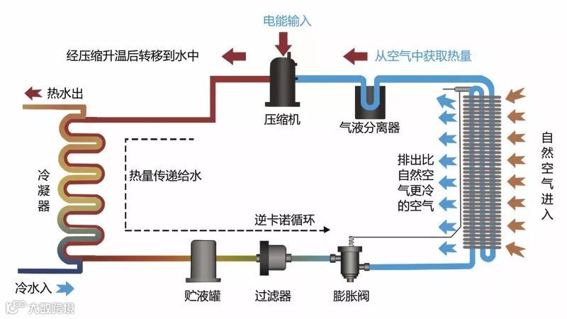 通过压缩机做功,使工质产生物理变相(气态--液态--气态),利用这一往复循环相变过程不断通过"低压锅"(蒸发器)吸热和"高压锅"(冷凝器)放热,由吸热装置吸取免费的热量,经过热交换器使冷水升温,制取的热水通过水循环系统送至用户,所以热泵并不违反热力学定律。