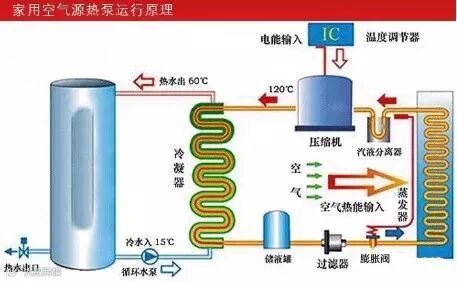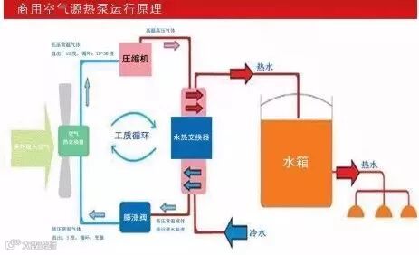 热泵用制冷剂作为媒介,制冷剂汽化温度低,在-40℃即可汽化,故此,它与外界温度存在着温差,冷媒吸收了外界的温度后汽化,通过压缩机压缩制热,变成高温高压气体,再经热交换器与水交换热量后,经膨胀阀释放压力,回到低温低压的液化状态,通过制冷剂的不断循环并与水交换热量,将水罐中的水加热。