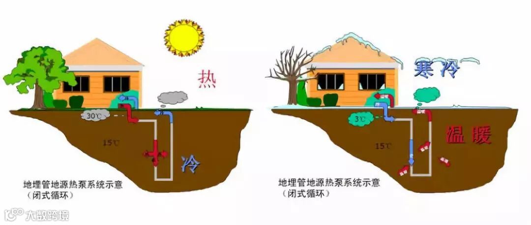 地源热泵是从大地里提取冷热量。由于大地吸收了47%的太阳能,所以较深的地层能常年保持恒定的地温,它远高于冬季的室外温度,又低于夏季的室外温度,因此地源热泵可克服空气源热泵的技术障碍,且效率大大提高。