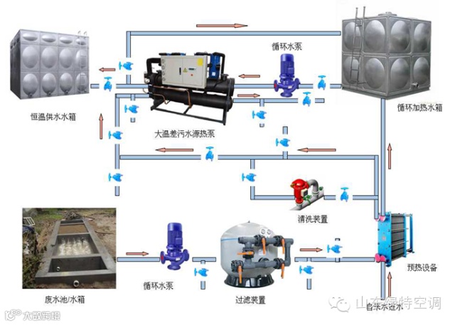 大温差污水源热泵制热系统利用浴池废热作为热源,污水温度高,不存在蒸发器结霜问题,而且水源热泵的机械运动部件非常少,所有部件安装在室内,从而避免了室外恶劣气候的影响,节省了维护费用。