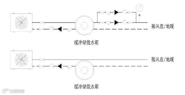 第二张图主要是在做开式水箱,比如大型中央空调,就是采用这种的缓冲水箱,它不叫蓄能,一般小系统不适合这样的水箱。第一张图中的系统表示一级二级分水,一级供水主机针对空气能水箱,故障率较少。因而建议使用第一张图。