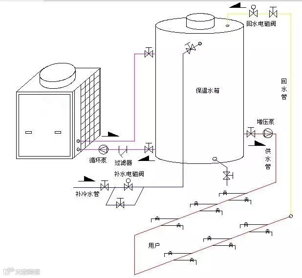缓冲水箱的底部出口接入水泵的吸水口,该吸入口进入的水是不含气体的(气体在水箱上部无法下来),水泵叶轮的气蚀现象会大大减少。吸入的水为纯水,水泵循环出的水会将系统中的气体自然推动到系统出水口,然后进入缓冲水箱上部进水口,系统出水带来的气体会被水箱顶部排气阀强制排除,进而成为一个良性循环。而无缓冲水箱系统,水泵吸入含气的水,叶轮会将气体打碎输进系统,造成系统中的气体到处存在,排气难度更高。造成水泵的流量开关经常报警,不断启停,大大增加了调试难度。