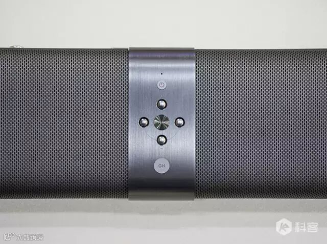 机身中心部分,采用的是铝合金拉丝阳极工艺,很好地与两边的小孔进行区分。中间部分上设置了7个按键,分别是音量大小、上一首下一首、播放停止、切换到音乐频道按钮以及电源开关按钮。以这么来看,它们的主要作用还是用于基本的听歌操作。