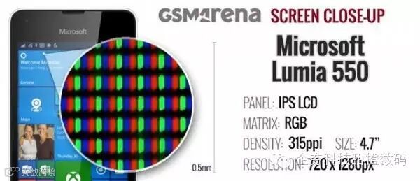 从显微镜下观察,Lumia 550的显示屏采用了标准的RGB像素排列。