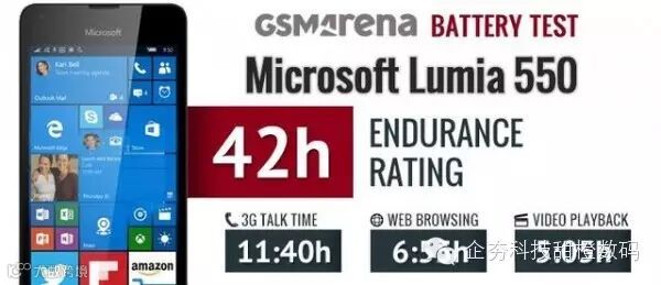 Lumia 550的电池容量为2100mAh,承诺可带来超过670小时的待机和最高14小时的通话。在测试当中,这部手机在压力测试当中坚持了42小时。虽然它只能坚持5小时的连续视频播放,但值得注意的是,在50%的屏幕亮度之下,其显示屏的亮度也达到了200尼特,比不少手机都要高。