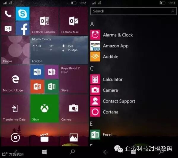 Win10 Mobile的用户界面给人的感觉相当熟悉,当中包含动态磁贴主屏幕、所有应用列表、带功能开关的通知中心、以及组织紧密的设置菜单。和WP7/8一样,Win10 Mobile仅支持2个主屏幕,其中之一包含着手机中所有的动态磁贴、静态图标和文件夹,而另一个主屏幕则会显示可滚动的应用列表。你可以如往常一样对磁贴的大小进行调整,或是对其进行固定。