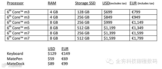 此外MateBook将标配PU材质的公文包,并有多种颜色选择,可以放入笔记本与键盘本体。有趣的是MateBook的电池在1小时内即可充电至60%,并且充电器支持5/9/12V的电压适应,也就是可以同时为手机快速充电。键盘方面采用防泼溅设计以及1.5mm键程设计,在实用性与手感表现都较为不错。并且其害可配备MatePen触控笔,以及采用侧边指纹解锁功能和拓展坞。