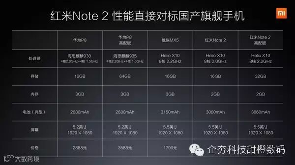 红米Note 2不但拥有着旗舰的Helio X10处理器,而且还配备有2GB的内存,16GB/32GB的存储空间可供选择,电池容量也高达3060mAh(支持拆卸),同时适配刚刚发布的MIUI 7。相机规格为前置500万+后置1300万组合。