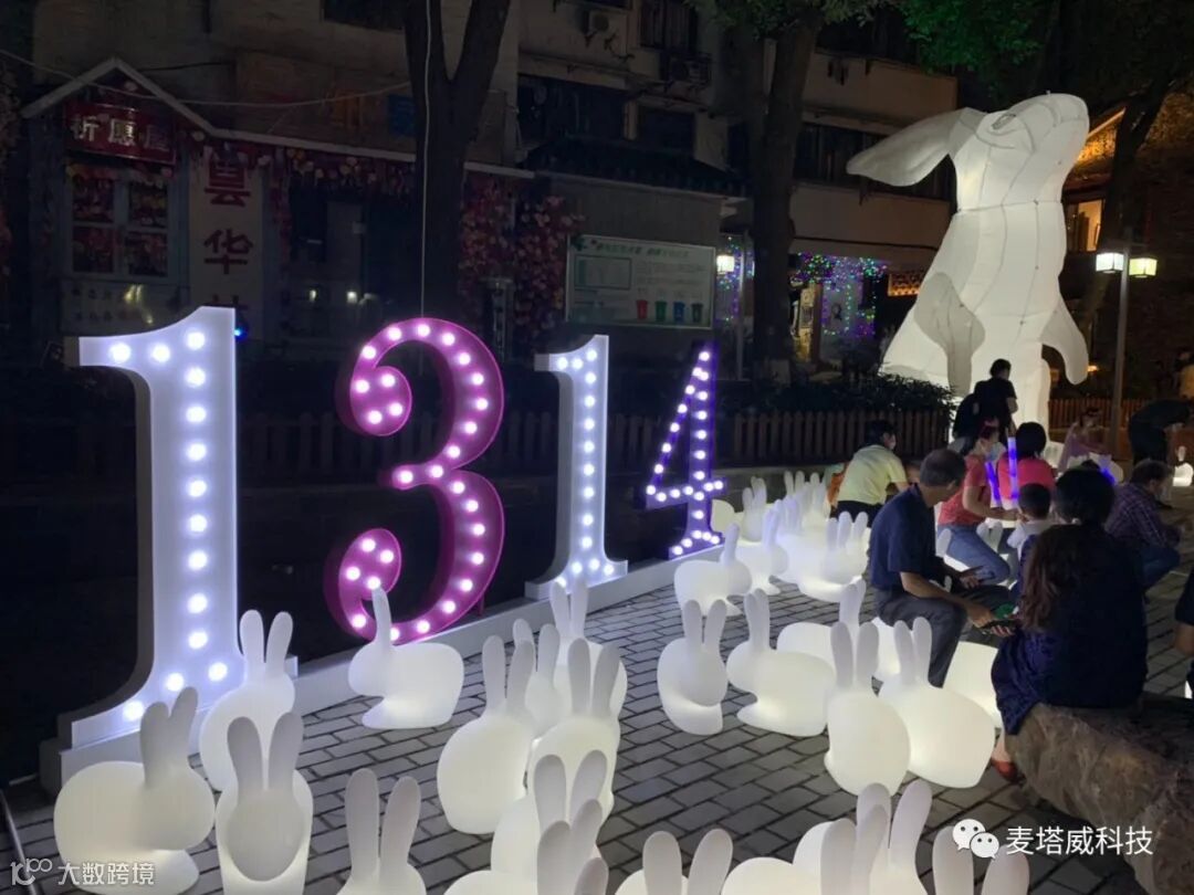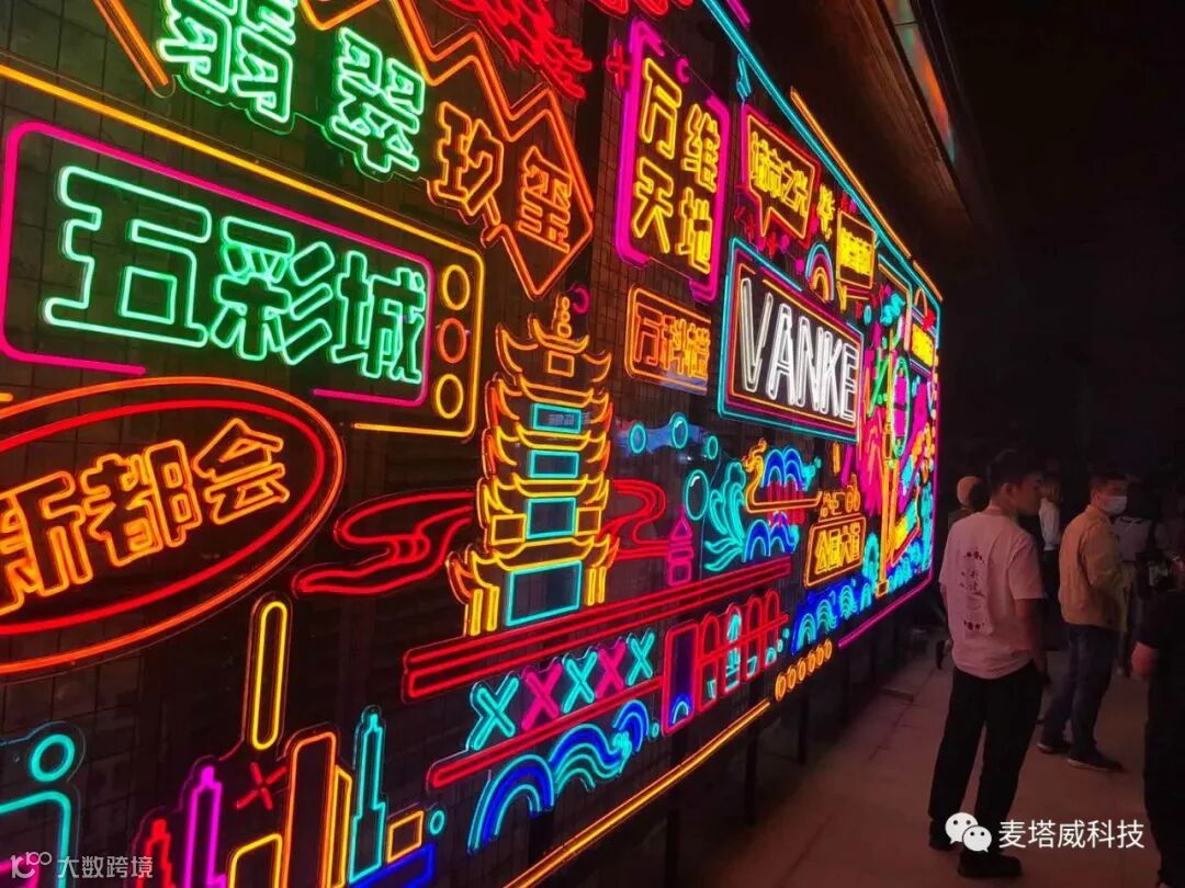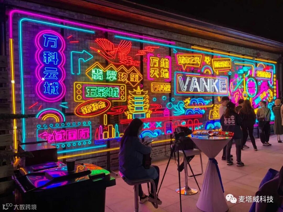 霓虹灯勾勒出一整面壁画,展现光影节主题、城市滨江天际线和万科楼盘,时尚轻奢,热闹非凡。