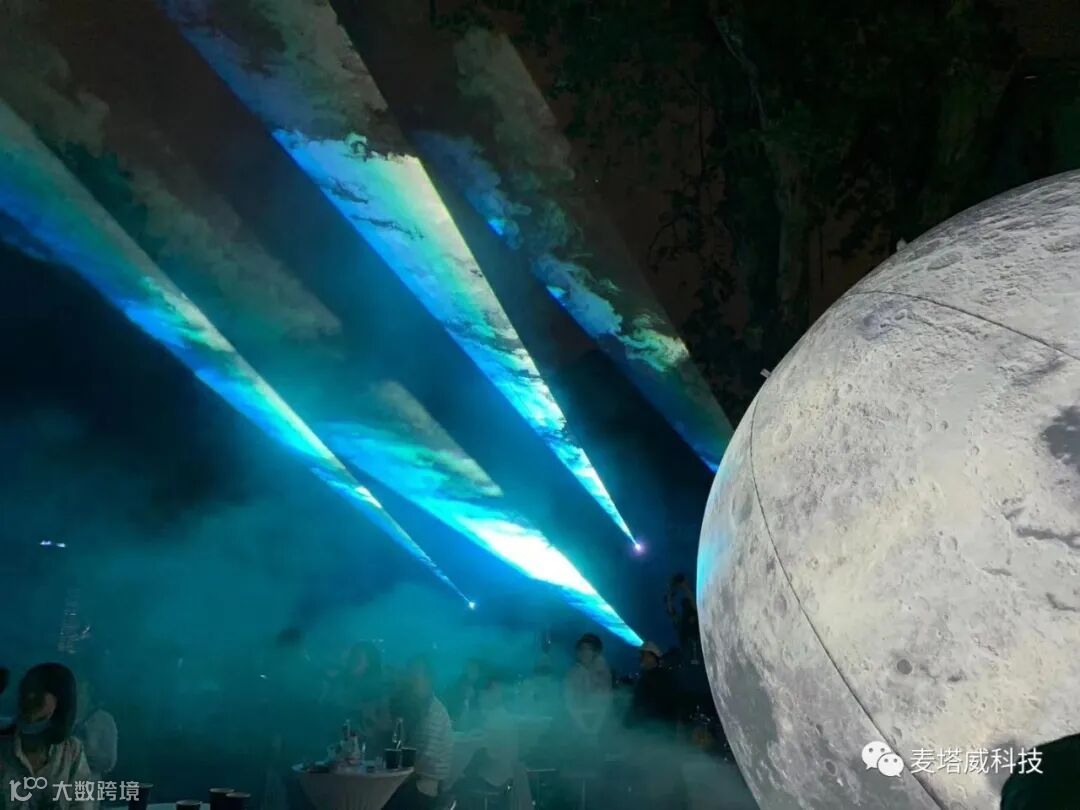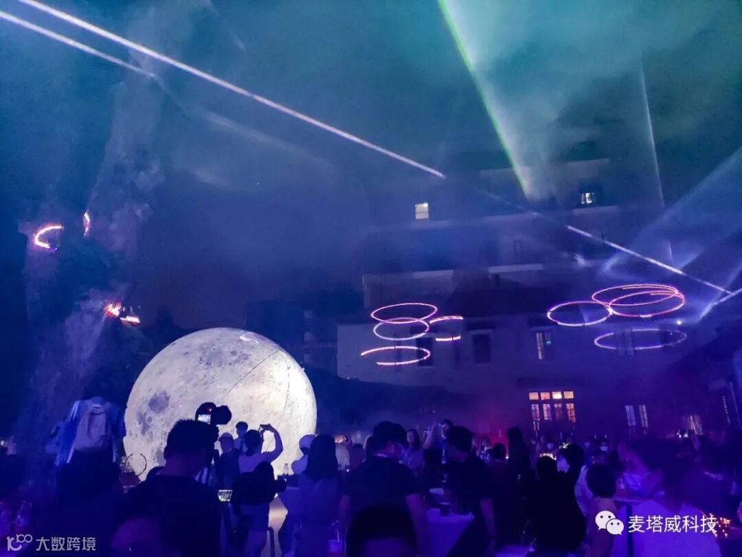 万科广场用气雾机和激光结合,通过用圆月、激光海洋营造出水中月之景,观众们在这里共赏明月,共观秀演,感恩英雄。