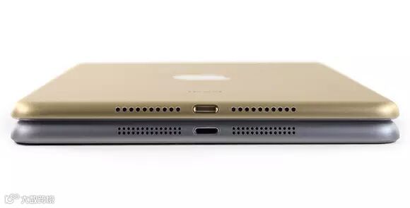 在机身设计上,原来底部对称的两排扬声器孔减少到了一排,不过每个孔的直径相应得到了增加。另外,与iPad Air 2一样,它也取消了静音键,这一设计也是为了减小空间,降低机身的厚度。