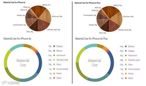 不过,相比屏幕组件,其他部件的重量均有所减少。比如全新的7000系铝合金材质添加了金属锌,在强度上得到了增加,但是重量却分别减少了1克(6s)和2克(6s Plus)。而电池组件,iPhone 6s电池容量为1715mAh比前代减少了95mAh,重量降低了2g;iPhone 6s Plus电池容易为2750mAh,相比前代减少了165mAh,重量则维持不变。