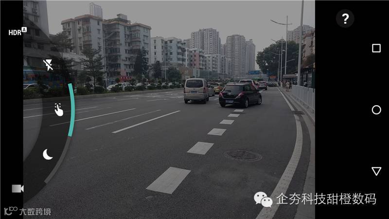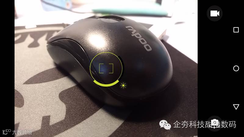 相机界面依然十分简化,从左往右拖动能呼出选项栏,右划能查看图片,拖动对焦框才能进行手动对焦和调整亮度,点击屏幕任意位置进行拍摄,选择右上角的摄影机能直接开始录制视频。拍摄的快门反应很快,但老实说这种拍摄逻辑让第一次上手使用该机的笔者感到有点不适应。