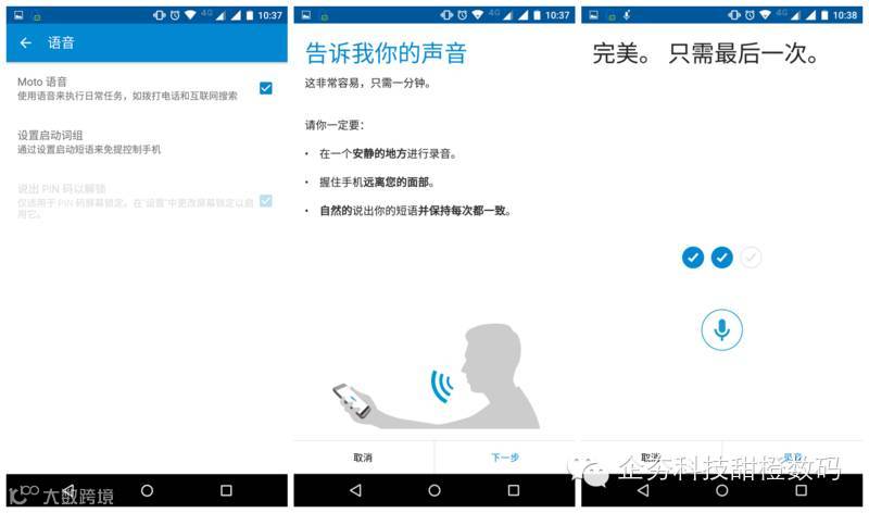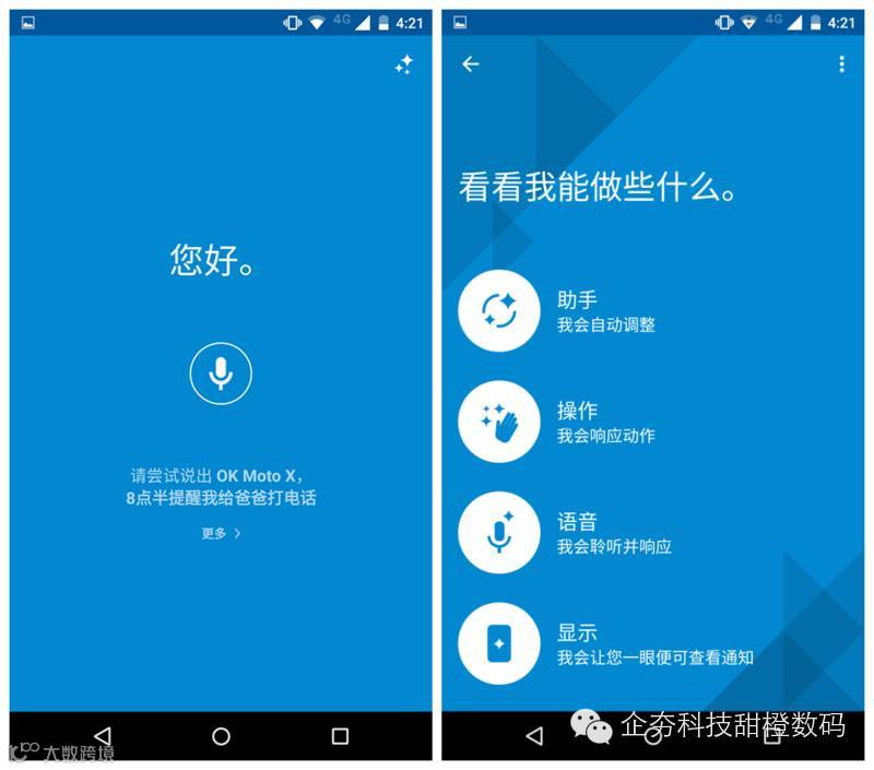 “MOTO语音”已经不是第一次出现在Moto X系列中了,该程序是为取代Google Now而配置的。不同于iOS8版的Siri需要按键呼出,MOTO语音是全天候待命,用户可在息屏待机时通过自定义指令与特定声纹来唤醒语音助手,语音搜索则调用灵犀语音助手来进行。