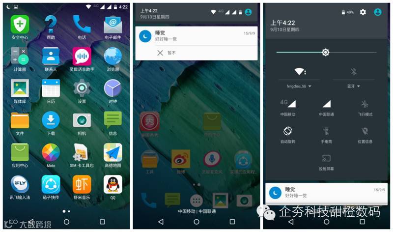 通知栏与菜单仍然是采用二级菜单,下拉一次显示通知栏,二次下拉才能显示快捷按钮,应用程序之间的切换速度较快。