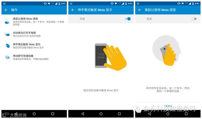 “MOTO操作”功能可根据手机重力和距离感应器自动唤醒手机和操作,譬如靠近手机可直接唤醒显示;甩动手腕两次可开启手电筒;靠近耳朵能自动打开Moto语音功能;翻转手机两次可快速打开相机,再次翻转两次能切换至前置相机。当然这些功能均可以设置单个开关,统一地被整合进“MOTO操作”程序里。经过笔者初步体验,手势识别准确率大概是80%,虽然偶尔有误,但这个成绩也比同样拥有该功能的手机理想,毕竟额外的传感器与运算芯片使识别灵敏度和准确率都大大提升了,感觉很爽。