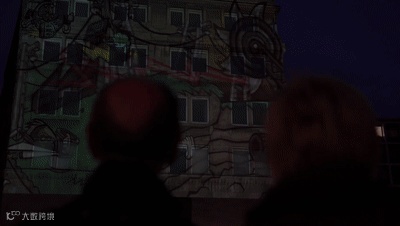 这是一件互动灯光投影作品。传感器将记录下街道上人们的活动,从而改变在Folkwang博物馆上的投影画面。