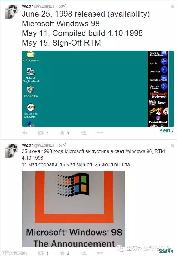 此外,WZor还回顾了Windows 98的发布流程,其最终版本号为4.10.1998,于5月11编译完成,随后又在5月15日签署RTM,直到6月25日正式发布。