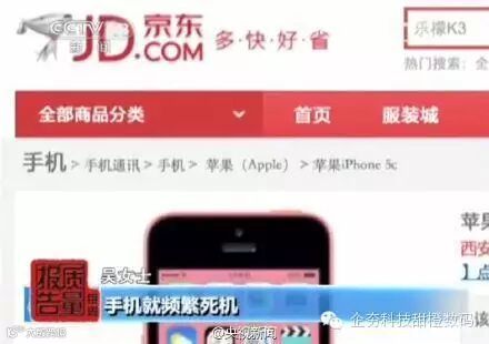而据央视《每周质量报告》报道称,消费者吴女士在京东上购买iPhone手机,结果出现频繁死机、不能更新程序,以至后来完全不能开机等问题,后经苹果授权维修点检测证明“机内主板扫码序列号与机身外的序列号不符”,属于翻新机。