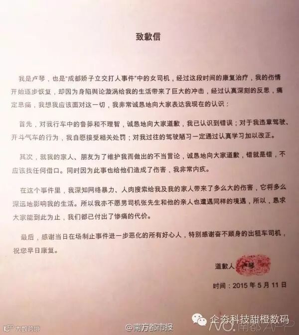 我是卢琴,也是“成都娇子立交打人事件”中的女司机,经过这段时间的康复治疗,我的伤情开始逐步恢复,却因为身陷舆论漩涡给我的生活带来了巨大的冲击,经过认真深刻的反思,痛定思痛,我想我应该面对这一切,我非常诚恳地向大家表达我现在的认识: