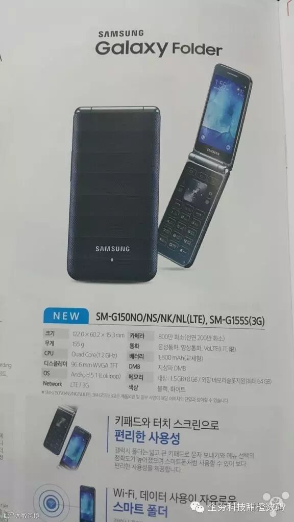 不久前根据韩国媒体 Business Korea 报道,三星正准备推出一款名为 Galaxy Folder 的新机,机如其名这是一款具有实体键盘的翻盖手机,机身规格为 122×60.2×15.3mm、重 155g,LTE 和 3G 两个版本的型号分别为 SM-G150N 和 SM-G155S。